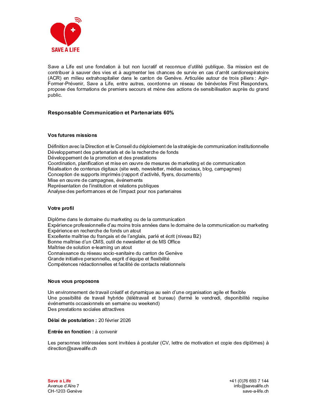 Save a Life est une fondation à but non lucratif et reconnue d’utilité publique. Sa mission est de contribuer à sauver des vies et à augmenter les chances de survie en cas d’arrêt cardiorespiratoire (ACR) en milieu extrahospitalier dans le canton de Genève. Articulée autour de trois piliers : Agir-Former-Prévenir, Save a Life, entre autres, coordonne un réseau de bénévoles First Responders, propose des formations de premiers secours et mène des actions de sensibilisation auprès du grand public.